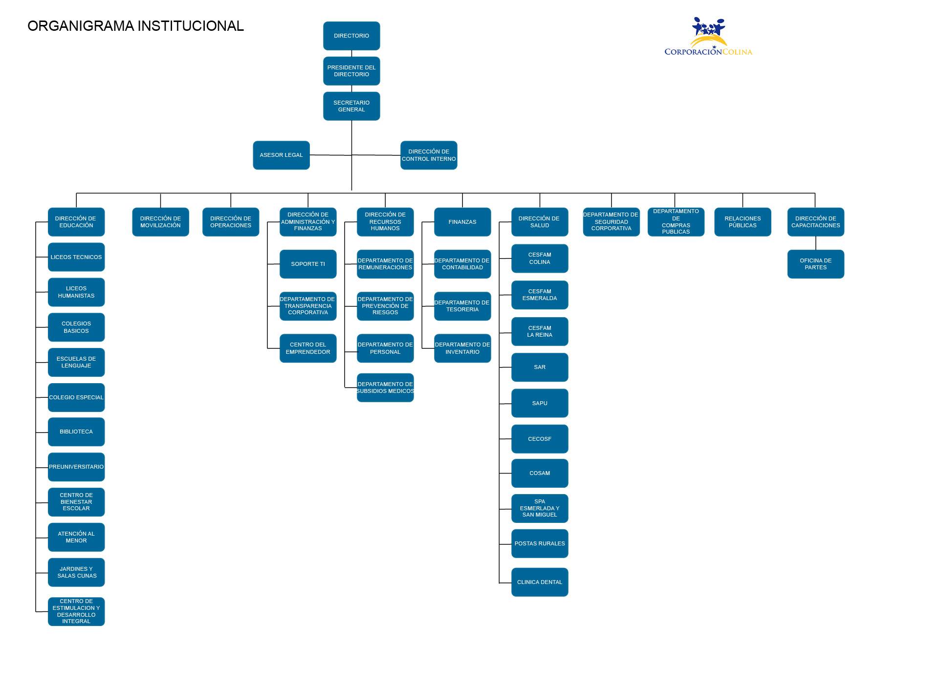 Con relaciones jerárquicas claramente establecidas, el nivel central cumple el rol normativo, técnico y fiscalizador de los establecimientos que dependen de la Corporación Municipal de Desarrollo Social de Colina